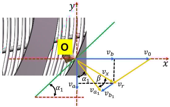 The speed of the stone on the flow-aiding spiral blade is decomposed, as shown in Figure 6. The linear speed of the stone moving with the spiral blade is , the sliding speed of the stone relative to the blade is , and the spiral angle of the guiding spiral blade is . In the actual movement process, due to the effect of friction, there is an angle b between the movement speed of the stone and the tangent direction of the spiral blade. During the conveying process, the movement of stones on the spiral blades is divided into two directions. One is axial movement along the height direction of the spiral blades, that is, the conveying direction of the drum; the other is circular movement, along the tangential direction of the spiral blades, driven by the rotation of the spiral blades. In the figure, is the actual speed of the stone, is the axial speed of the stone, and is the circumferential speed of the stone; and are the cloud activity speed and the sliding speed of the stone relative to the blade without considering the friction force. The decomposition formula is as follows: