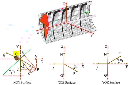 In order to design and clarify the appropriate structure and operating parameter range of the drum screen, the stones in the drum are simplified as point masses, and the forces acting on the spiral blades are analyzed [26]. The forces on the stone during its movement include its own gravity G, the normal thrust of the spiral blade on the stone, the friction between the stone and the screen, and the friction between the stone and the blade, as shown in Figure 7. The angle of deviation of the resultant force F acting on the stone is equal to the friction angle , and is the angle between the line connecting the stone and the axis and the vertical line. The resultant force on the stone is decomposed into the tangential force along the spiral blade and the axial force .