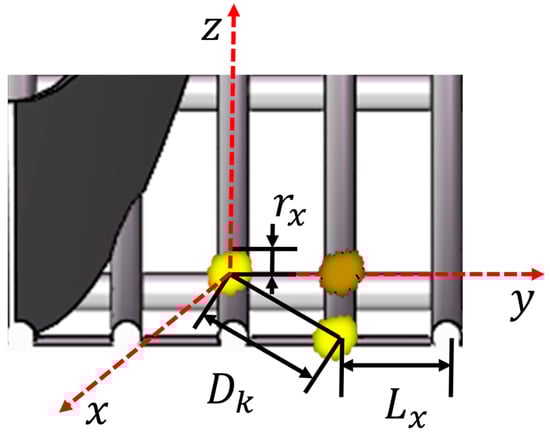 After the conveying performance requirements of the drum screen are met, the layout of the spiral blades in the drum should also meet the separation requirements for the soil mixture so that, after the soil mixture enters the drum from the feeding port, the center of gravity can be moved below the screen plane in time; that is, the time for the soil mixture to move one screen hole on the drum screen must be greater than the time required for the center of gravity of the soil mixture to move below the screen plane. The movement trajectory of the soil mixture on the drum screen surface is shown in Figure 8.