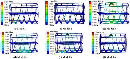 The sixth-order vibration frequency of the spiral blade ranges from 23.774 Hz to 31.753 Hz. The third-order bending vibration has the greatest influence on the deformation of the spiral blade, with a vibration frequency of 26.224 Hz. The overall deformation of the spiral blade is large and bulges toward the positive direction of the Z axis; the fourth-order and fifth-order bending vibrations have moderate effects on the deformation of the spiral blade, which is manifested as most of the spiral blade being deformed, and the deformation of the middle part is the largest, making the spiral blade flat; the first-order, second-order, and sixth-order bending vibrations have little effect on the deformation of the spiral blade, causing deformation only on part of the spiral blade. The deformed part becomes flat and the deformation angle is different. Table 2 shows the natural frequencies and maximum deformations corresponding to each order. The maximum speed of the drum during operation is 42 rpm. The basic conversion relationship between the speed and frequency of the spiral blade is n = 60 × f. The maximum excitation frequency of the spiral blade is 0.7 Hz, which is much lower than the minimum natural frequency of the spiral blade, 23.774 Hz. Therefore, the spiral blade will not produce resonance during operation and the structural design is reasonable.