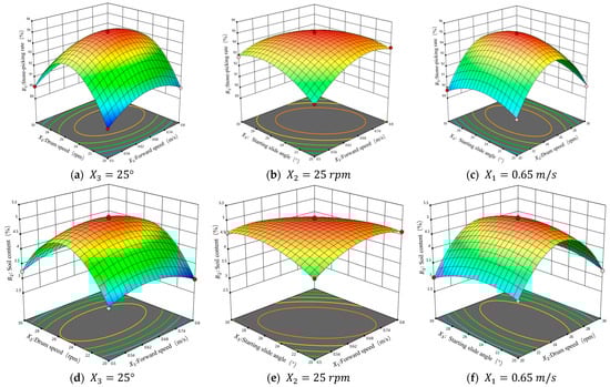 The variance analysis of the picking rate and soil content of the stone picker is shown in Table 5. When p < 0.01, it indicates that the model is extremely significant and the lack of fit item p > 0.1, indicating that the model is highly reliable. It can be seen that experimental factors and have significant effects on the picking rate of the stone picker; in the interactive effect of experimental factors, , , , have a very significant effect on the picking rate of the stone picker, have interactive effects on the picking rate of the stone picker, and the other experimental factors have no significant effect on the picking rate of the stone picker. According to the coefficients of the regression equation, the factors that affect the picking rate of the stone picker are , , and from large to small. The reason is that, as the drum speed increases, the centrifugal force on the stones increases, forcing the stones to be thrown quickly to the collection device, reducing the missed collection due to gravity sedimentation. At the same time, as the speed increases, the conveying efficiency of the blades increases, which directly affects the stone-picking effect of the stone picker.