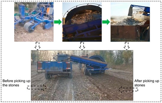Arable land resources are essential resources for promoting the development of the agricultural economy. Stones in farmland soil are one of the key factors restricting the efficiency of agricultural mechanization and the quality of crop growth [1,2]. The presence of many stones in farmland will accelerate the loss of surface soil and water and increase the wear and tear of agricultural machinery. Although traditional stone pickers can achieve basic soil–rock separation, there are problems such as severe soil disturbance, high soil content, missed stones, and unbalanced energy consumption during operation [3,4]. Especially in complex working conditions with clay soil or the uneven distribution of rocks, the separation efficiency and operating stability of existing equipment are significantly reduced, making it difficult to meet the needs of precision agriculture [5]. Therefore, agricultural arable land urgently needs stone-picking equipment with high separation efficiency and a high picking rate.