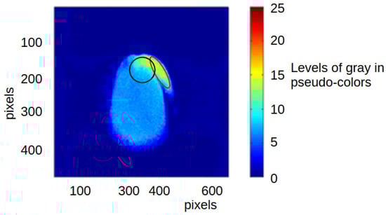 In the local approach for analyzing the BSL, the region of interest (ROI) is a delimited area of the seed where a physiologic response to germination is expected. The two local ROIs observed in this work were the vascular area and the embryonic axis. In Figure 2, the vascular and embryonic regions are delimited in the map of the activity of a seed. The vascular region is presented in Figure 2 by the area within the black circle, and the embryonic axis is delimited by a red ellipse. The map is expressed by the graphical outcome of the BSL index, which is known as the Absolute Value of the Differences (AVD) [23] and named GraphAVD. The pseudo-color from blue to red represents the level of activity from low to high, respectively. GraphAVD is presented by Equation (2):