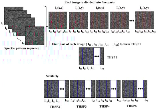 The global analysis of the BSL implemented in this work was the Full Time History of the Speckle Pattern (FTHSP) presented by [19]. The collection of images of the speckle patterns in time was analyzed by creating five sections of the image sequence to build the THSP. In Figure 3, one can see the image sequence, as well as the illustration of the five sections that were used to build each THSP that was used to obtain the numerical index (AVD1), as presented in Equation (3). In Equation (7), one can observe how the global AVDG was obtained using the five AVD1 indices obtained in the sections: