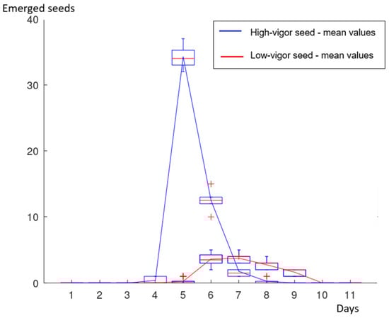In Figure 4, one can observe the counting of the seeds’ emergence in accordance with the day of monitoring. Therefore, counting was expressed by the two boxplot graphs: one for the high-vigor group of seeds and the other for the low-vigor group.