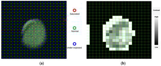 The regions of interest in the seed, vascular area, and embryonic axis presented good standards for the two features: the level of illumination and contrast. The vascular area and the embryonic axis presented enough light, as expressed by the green circles, meaning that the ROI in the seed was not underexposed to light nor did they receive over-illumination that resulted in the saturation of the pixels. The adjusted thresholds for the under-exposition of light were set to 35 on a grayscale (0 to 255), and for the over-illumination scenario, they were set to 220 on a grayscale. Thus, the blue circles represent the level of light equal or under 35; the red circles represent the level of light over 220, and the green circles represent the level of illumination between 35 and 220. The absence of red circles in Figure 5a means the absence of saturation in the image. In the case of contrast, the ROI of the vascular area and the embryonic axis presented speckle grains with high contrast, as expressed by the light gray squares, which are expressed from 100 to 255 on grayscale values. Therefore, once the level of illumination and the contrast of the speckle grains were within the boundaries, we can guarantee that the BSL indices were not compromised.
