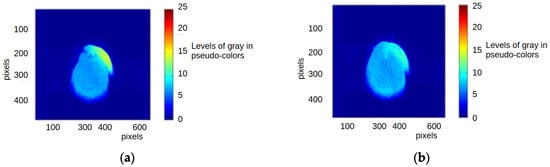In Figure 6, the map of the activity of one seed with high vigor and one seed with low vigor by means of GraphAVD is presented. The pseudo-color from blue to red represents the level of activity from low to high, respectively. It is possible to observe higher activity in the embryonic axis of the high-vigor seed.