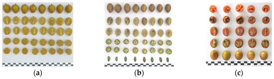 Three cultivars used in this study. Note: (a) ‘Wuhe’ wampee; (b) ‘Huami No. 3’ wampee; (c) ‘Zirou’ wampee. Bar = 1 cm.