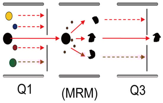 For metabolite quantification, multiple reaction monitoring (MRM) mode on a triple quadrupole mass spectrometer was employed. The MRM analysis is shown in Figure 2. The first quadrupole filters the target precursor ion (parent ion), eliminating interference from other ions with similar mass-to-charge ratios. The selected precursor ion undergoes collision-induced dissociation (CID), generating fragment ions. The third quadrupole then isolates a specific product ion, further reducing background noise and enhancing quantification accuracy and reproducibility. Following MS data acquisition, chromatographic peak areas were integrated for all detected metabolites. Cross-sample peak alignment and integration correction were applied to the same metabolite across different samples [26].