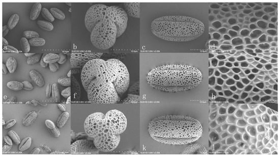 The electron microscopy of the pollen surface structure of three C. lansium. Note: (a,e,i) display the overall morphology of pollen grains from ‘Zirou’ wampee, ‘Wuhe’ wampee, and ‘Huami No. 3’ wampee, respectively (scale bar = 50 μm). (b,f,j) show the polar views of pollen grains from ‘Zirou’ wampee, ‘Wuhe’ wampee, and ‘Huami No. 3’ wampee, respectively (scale bar = 10 μm). Panels (c,g,k) present the equatorial views of ‘Zirou’ wampee, ‘Wuhe’ wampee, and ‘Huami No. 3’ wampee, respectively (scale bar = 10 μm). Panels (d,h,l) exhibit the exine ornamentation patterns of ‘Zirou’ wampee, ‘Wuhe’ wampee, and ‘Huami No. 3’ wampee, respectively (scale bar = 4 μm).