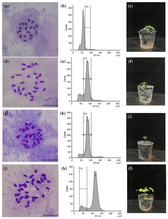 The polyploid plant identification of seedlings of ZR × WH. Note: (a) the chromosomes of CK (diploid, 2n = 2x = 18); (b) the flow cytometry histogram of CK, PI-H = 50 × 103; (c) the plantlet of CK; (d,g) the chromosomes of H1 and H2 (triploid, 2n = 3x = 27); (e,h) the flow cytometry histogram of H1 and H2, PI-H = 75 × 103; (f,i) the plantlet of H1 and H2; (j) the chromosomes of H3 (tetraploid, 2n = 4x = 36); (k) the flow cytometry histogram of H3, PI-H = 100 × 103; (l) the plantlet of H3. PI-H, The height value of PI fluorescence signal; PI, Propidium iodide; * means PI stained. Bar = 10 μm.