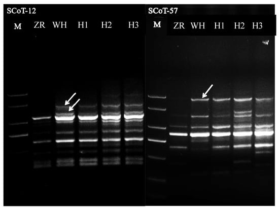 Polyploid plant hybrid identification by ScoT 12 and ScoT 57. Note: M: 2000 bp Marker; ZR: female parent, WH: male parent; H1, H2, and H3 mean the polyploid plants. The white arrow means the specific band of WH.