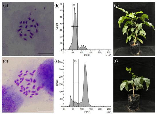 The polyploid plant identification of seedlings of HM3 by colchicine treatment. Note: (a) the chromosomes of CK (HM3 seeds treated with water, diploid, 2n = 2x = 18); (b) the flow cytometry histogram of CK, PI-H= 50 × 103; (c) the plantlet of CK; (d) the chromosomes of C1 (colchicine concentration 0.3%, 48 h, tetraploid, 2n = 4x = 36); (e) the flow cytometry histogram of H3, PI-H = 100 × 103; (f) the plantlet of C1. PI-H, The height value of PI fluorescence signal; PI, Propidium iodide; * means PI stained. Bar = 10 μm.