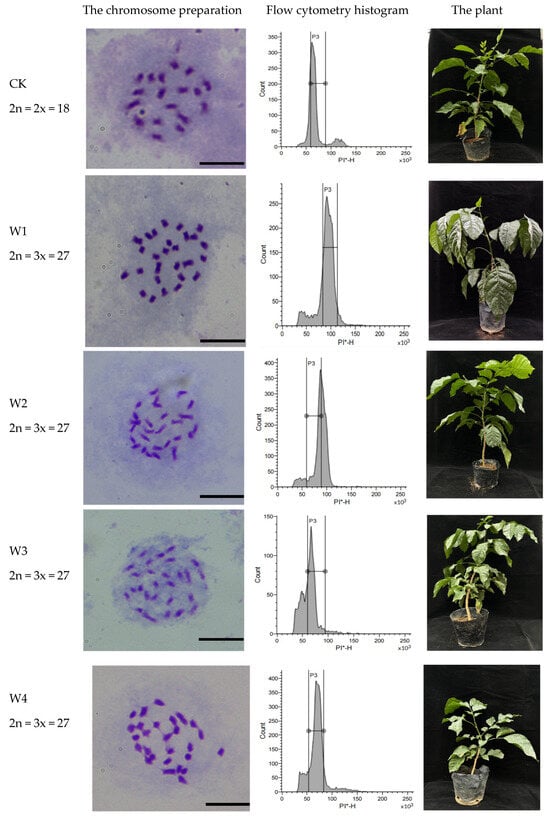 We referred to the flow cytometry method which was introduced by Weaver [23]. Fresh young leaf tissues (0.5 cm2) were excised and placed in sterile dishes containing 1 mL of LB01 nuclear extraction buffer. The leaves were rapidly chopped and allowed to stand for 1 min to ensure complete nuclear release. The resulting suspension was then pipetted and filtered through a 30 μm cell strainer. Subsequently, 10 μL of 10 mg/mL propidium iodide (PI) staining solution was added and thoroughly mixed. The samples were incubated in darkness at room temperature for 30 m for nuclear staining. Ploidy analysis was performed using a flow cytometer (BD Biosciences, FACSMelody, San Jose, CA, USA) equipped with 488 nm and 633 nm excitation lasers, with diploid plants serving as control materials.
