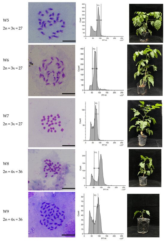 A total of 804 WH seeds were sown, yielding 446 seedlings with a germination rate of 55.3%. Initial screening by flow cytometry identified six mixoploid, seven triploid, and two tetraploid plants. Subsequent cytogenetic analysis via chromosome counting of leaf cells revealed that the six initially detected mixoploid plants reverted to diploid status. Thus, the final ploidy distribution consisted of seven triploid and two tetraploid plants (Figure 7).