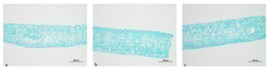 Leaf segments adjacent to the midrib were excised and fixed in FAA solution. Following conventional paraffin embedding and sectioning, the samples were double-stained with safranin and fast green to prepare permanent slides. Cross-sectional structures were examined under an optical microscope, with images captured at 100× and 200× magnification for target regions. Using ImageJ (v2024) software, quantitative measurements were performed to determine the dimensions, including the thickness of lower/upper epidermis, palisade mesophyll, and spongy mesophyll.