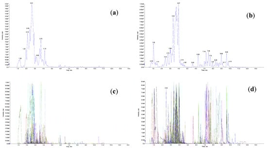 The TIC and MRM peak map for C. lansium. Note: (a) TIC in negative ion mode; (b) TIC in positive ion mode; (c) MRM in in negative ion mode; (d) MRM in positive ion mode. Each chromatographic peak in different colors represents a detected metabolite. The transverse coordinate for the metabolite detection RT (retention time); the ordinate is the ion flow intensity in cps (count per second).