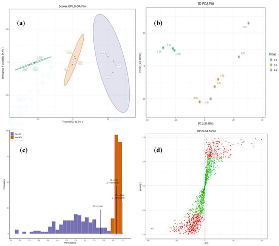 Since PCA is less sensitive to weakly correlated variables, partial least squares–discriminant analysis (PLS-DA) was employed to enhance variable discrimination. Further refinement was achieved using orthogonal partial least squares–discriminant analysis (OPLS-DA), which integrates orthogonal signal correction (OSC) with PLS-DA to partition the X-matrix into Y-related and Y-orthogonal components, thereby improving the detection of biologically relevant differential metabolites [27]. The OPLS-DA score plot (Figure 12b) highlighted clear inter-group metabolic distinctions, while model validation (Figure 12c) and the S-plot (Figure 12d) confirmed its robustness and identified key contributing variables.