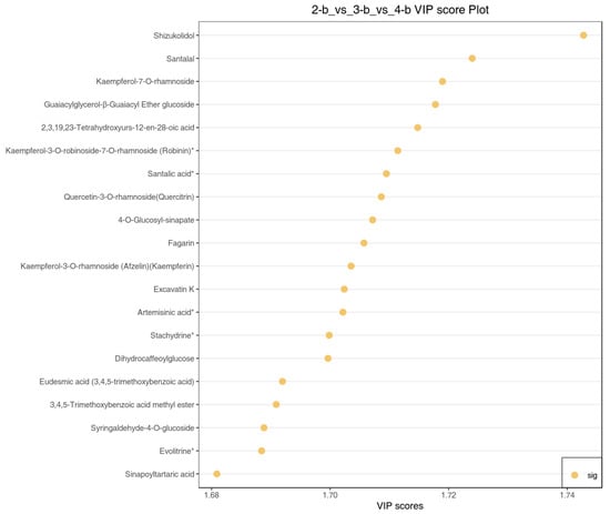 Differential metabolites were screened based on variable importance in projection (VIP) scores; the top 20 metabolites with the highest VIP values (Figure 13) represent key bioactive compounds that contribute substantially to C. lansium’s medicinal and physiological properties. These included six phenolic acids, four flavonoids, five terpenoids, three alkaloids, and two lignans/coumarins. These metabolites collectively enhance C. lansium’s medicinal value through antioxidant, antimicrobial, and anticancer properties while improving plant defense and stress adaptation. For instance, the most significant metabolite, shizukolidol, is a traditional medicine Chinese component with antibacterial activity [28]; santalal is kind of anti-tumor active compound which exhibits tumor-selective cytotoxicity [29]; Kaempferol-7-O-rhamnoside and Kaempferol-3-7-O-robinoside show aldose reductase inhibition with the potential to develop the treatment of diabetes [30], and the novel combination with MTX mildly improved the reduction in inflammation in experimental arthritis [31].