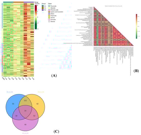 Differential metabolites of different ploidy materials of C. lansium. Note: (A) Heatmap of the differential metabolite clusters: The horizontal is the sample name, the vertical is the differential metabolite information; different colors are different values obtained after different relative content standardization treatments (red represents high content, green represents low content). Heatmap_class: Classification by the metabolite class; class is the first class of substances; heatmap_col-row_cluster: Both metabolites and samples are cluster analyzed; the cluster line on the left is the metabolite cluster line, and the cluster line above the graph is the sample; cluster.line.heatmap_row_cluster: Cluster analysis is performed only for the metabolites, and the cluster line on the left side of the figure is the metabolite cluster line. (B) Heatmap of differential metabolite correlation; transverse and longitudinal axle are both the name of different metabolites; different colors represent the Pearson correlation coefficient r; the legend on the right shows the correlation coefficient and color between groups; red is strong positive correlation, green is strong negative correlation; the deeper color represents the absolute value of the correlation coefficient between samples. Plots for all differential metabolites by default, showing the top 50 differential metabolites with the largest VIP value when the number of differential metabolites exceeds 50. (C) Venn of differential metabolite: Each circle in the figure represents a comparison group; the numbers in the overlapping circles represent the number of differential metabolites shared between the comparison groups, and the numbers without the overlap represent the number of differential metabolites unique to the comparison group. * means presence of isomeric forms of this compound, though the exact configuration remains undetermined, and the specific isomer cannot be identified.