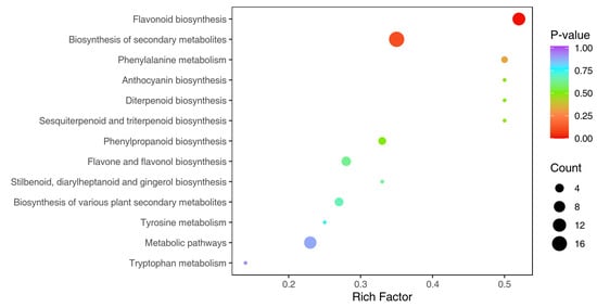 ‘N’ represents the number of metabolites with KEGG annotation in the total metabolites; ‘n’ represents the number of differential metabolites in N; ‘M’ represents the number of metabolites in a KEGG pathway in N; and ‘m’ represents the number of differential metabolites for a KEGG pathway in M. The closer the p-value is to 0, the more significant the enrichment. The size of the points in the plot represents the number of differentially significant metabolites enriched to the corresponding pathway. After selecting the top 20 pathways of p-values from small to large to analyze, as shown in Figure 15, only 13 pathways met the criteria in practice. The highest differential metabolite enrichment is in the ‘Flavonoid biosynthesis’ and the ‘Biosynthesis of secondary metabolites’ pathways, which are the most critical pathways for the medicinal component synthesis; this also indicated that the ploidy would affect the medicinal component accumulation.