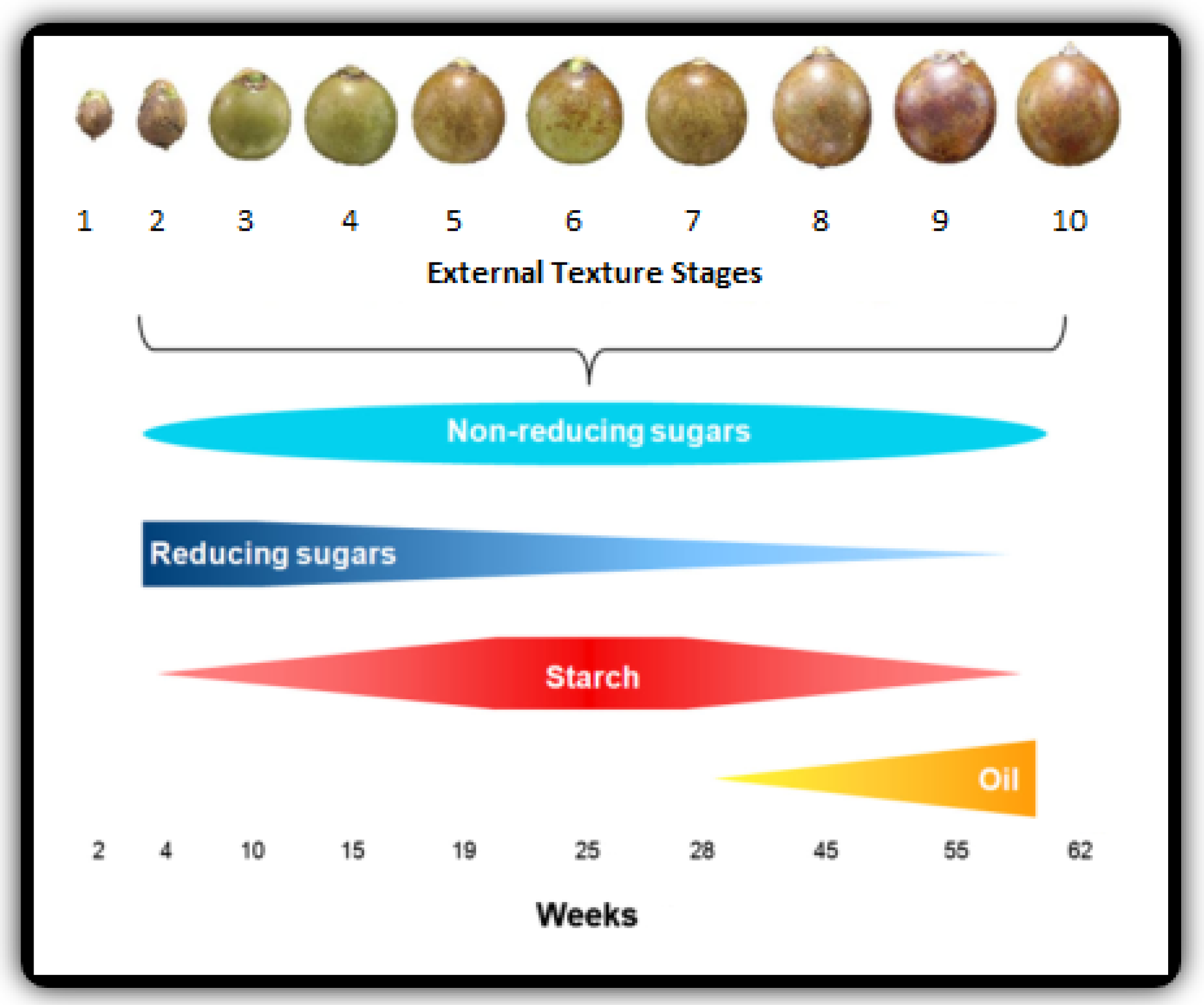 Figure 2). In this figure, we see the stages of the fruit’s external textures (1–10), listing their time spans in weeks on the horizontal axis (2–62). In addition, we can analyze the expected enhanced oil productivity of the fruit.