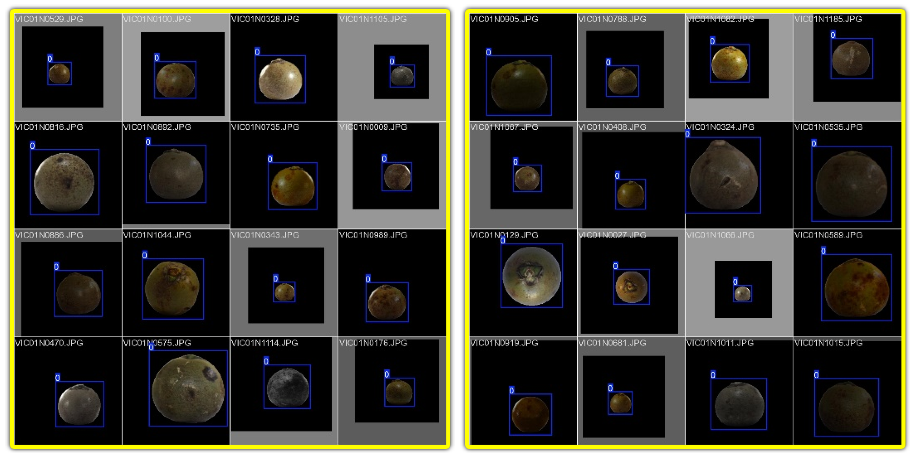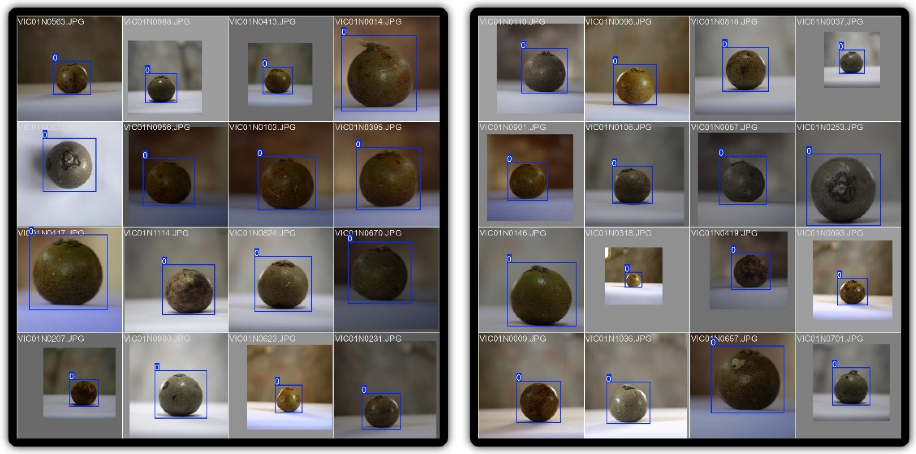 We employed a uniform sample of 50 macauba fruits, each systematically rotated through 32 discrete orientations under varying illumination conditions to maximize the visual expressivity of the dataset. By capturing each fruit at multiple angles and light positions, we ensured that our model was exposed to a wide range of appearance variations—shadows, highlights, and texture nuances—thereby enhancing its robustness to real-world imaging scenarios. It is further important to note that all fruits originated from the same inflorescence, harvested within a single seasonal window; this common provenance minimizes intraclass variability in local surface texture and color, allowing us to ascribe observed performance differences primarily to the effects of pose and lighting rather than underlying phenotypic heterogeneity.