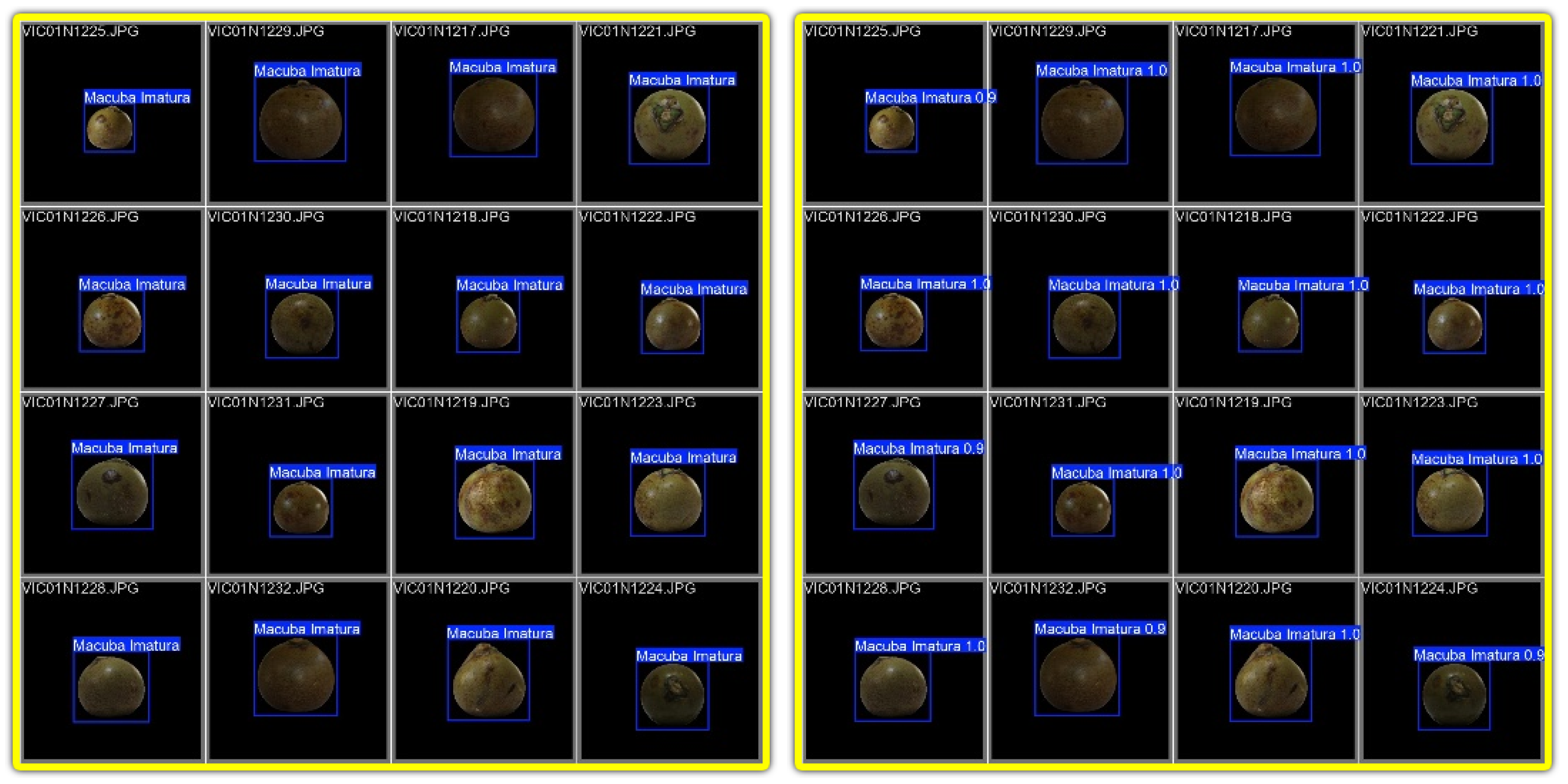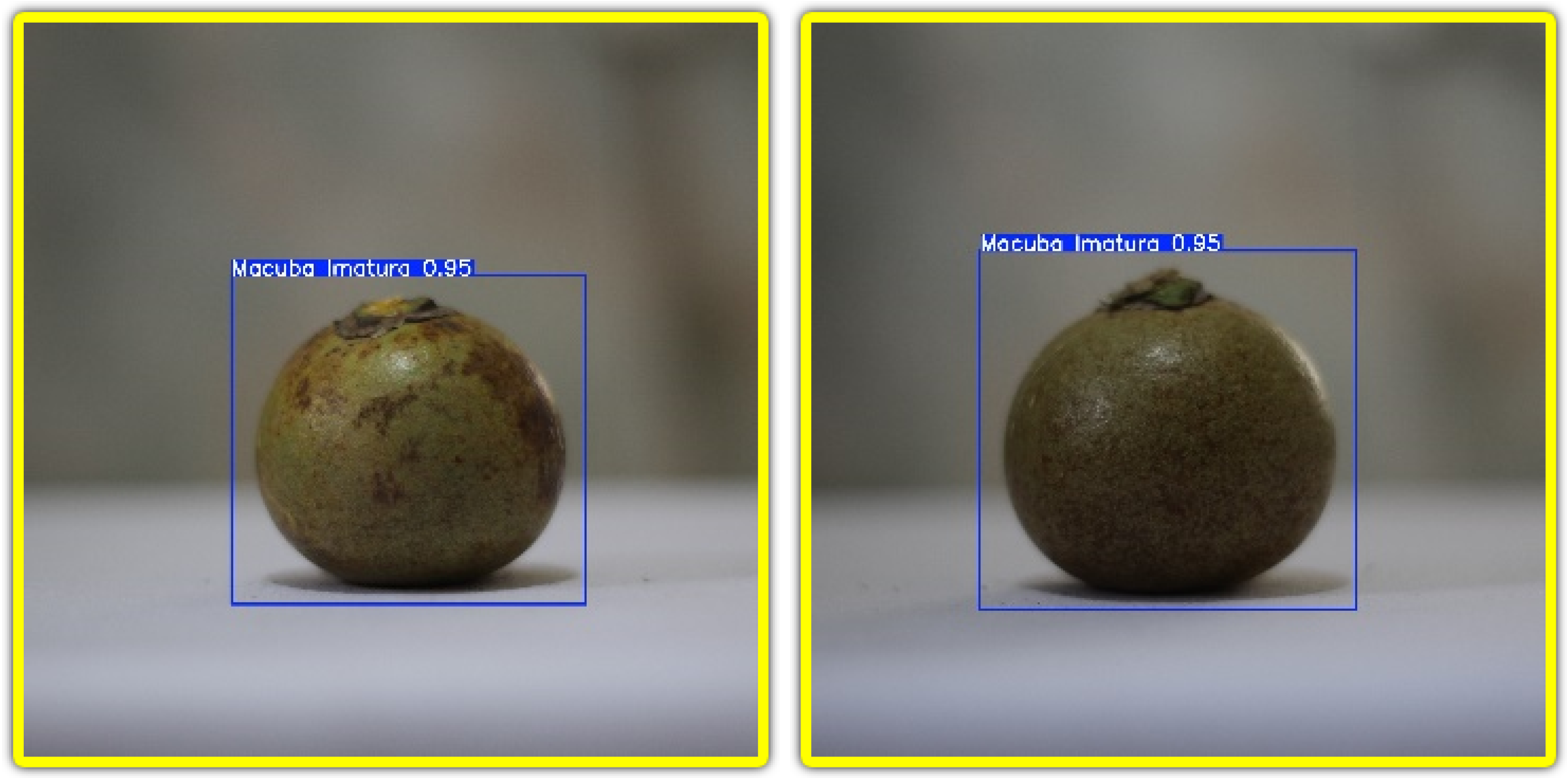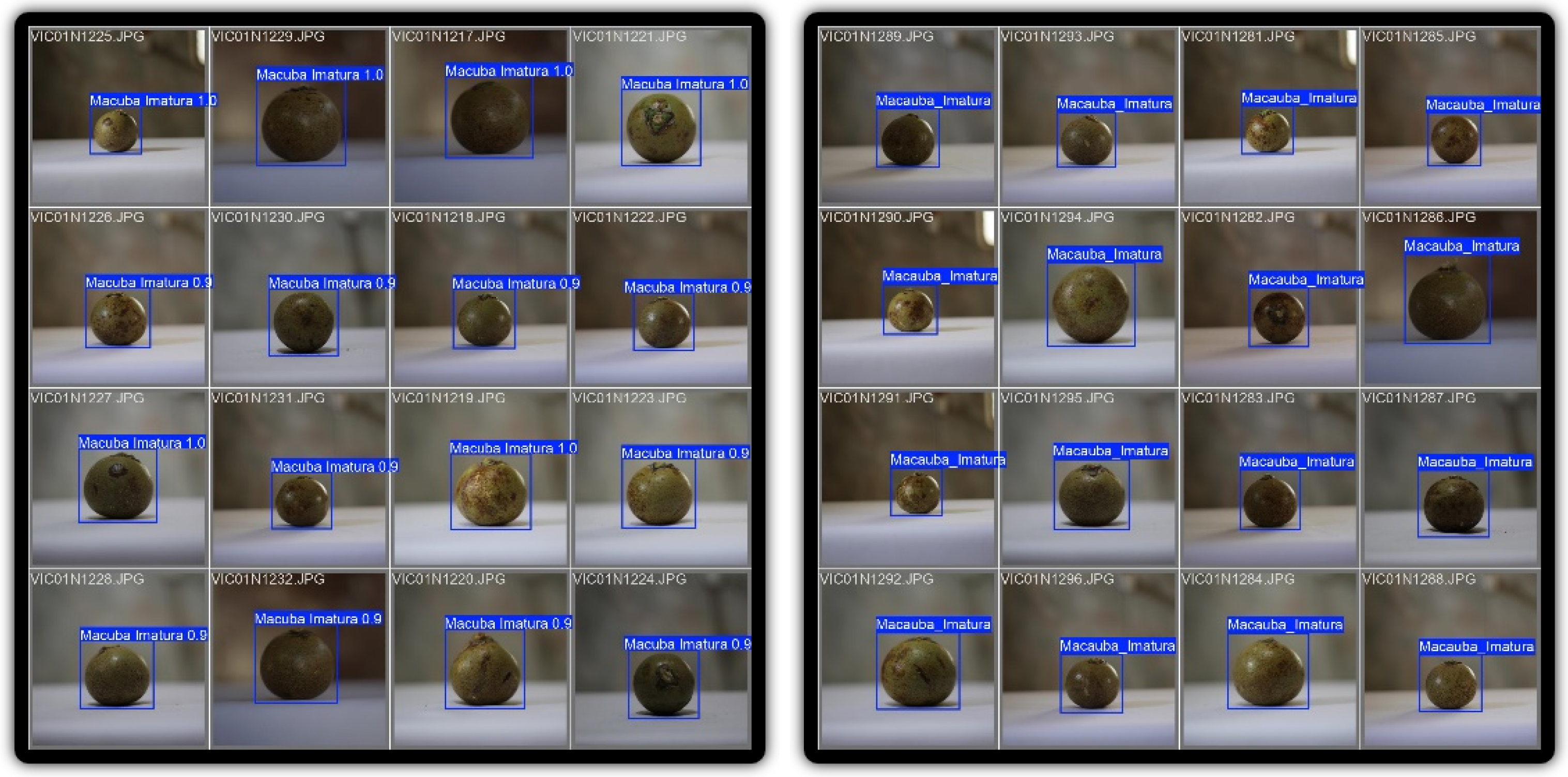 Table 2 present the results obtained after the validation of the training, which were obtained for the class Immature Macauba (“Macuba Imatura”), and highlight the performance of the developed model. With 300 images and 300 instances analyzed, the model achieved precision (precision) and recall (recall) both equal to 1.0.