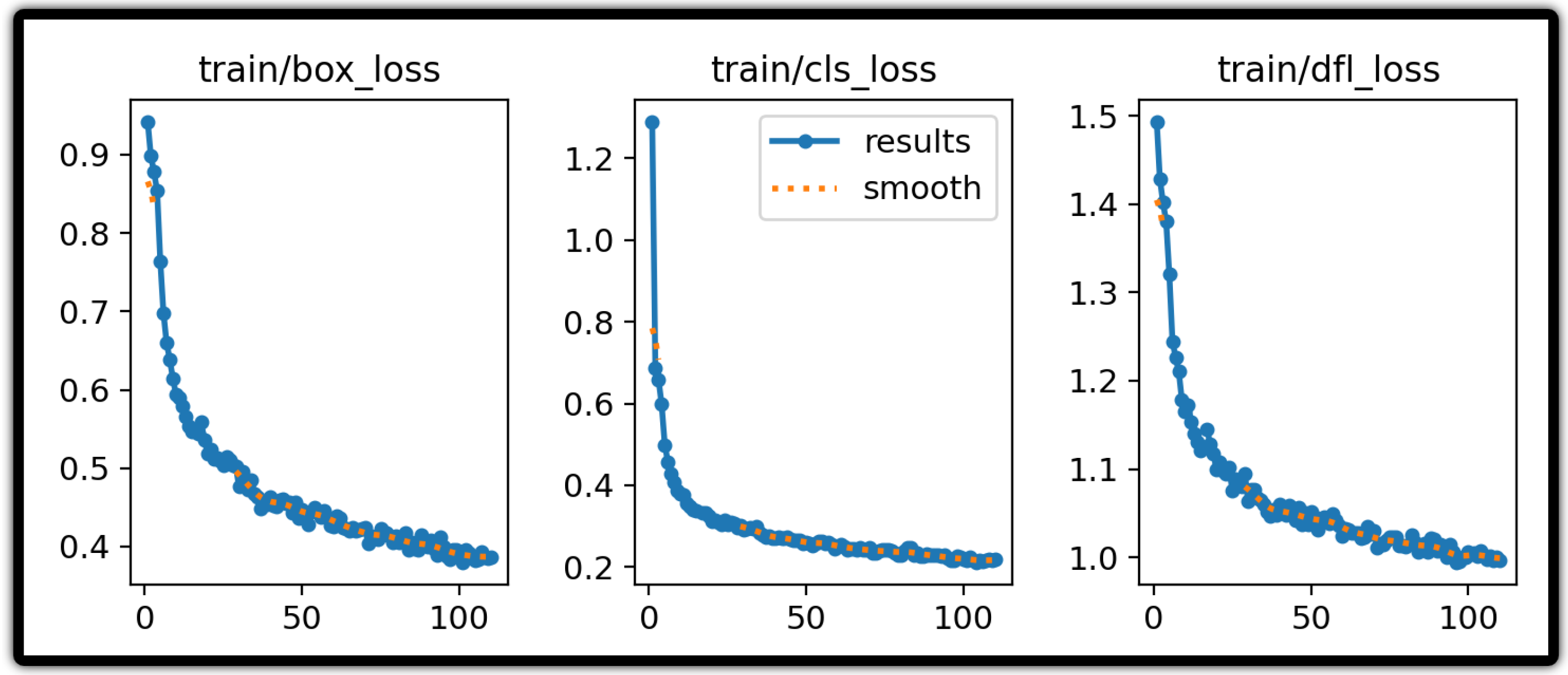 The two sets of training loss curves reveal a clear contrast in convergence behavior between YOLO11x and YOLO12x. In the YOLO11x charts, the box-regression loss falls steadily from about 0.87 at epoch 1 to roughly 0.27 by epoch 200, the classification loss declines from approximately 1.30 to 0.12, and the distribution-focal loss (DFL) drops from about 1.38 to 0.86. By contrast, YOLO12x—trained for only 106 epochs—sees its box loss decrease from around 0.94 to 0.38, its classification loss from 1.29 to 0.21, and its DFL from 1.49 to 1.00. Although both models exhibit a rapid initial loss reduction followed by a slower, smoothing tail, YOLO11x achieves substantially lower final loss values across all three components, indicating a more thorough optimization of bounding-box regression and class predictions. In contrast, YOLO12x converges to higher residual losses, suggesting that its deeper architecture may require additional epochs or further tuning to match the convergence depth of YOLO11x (