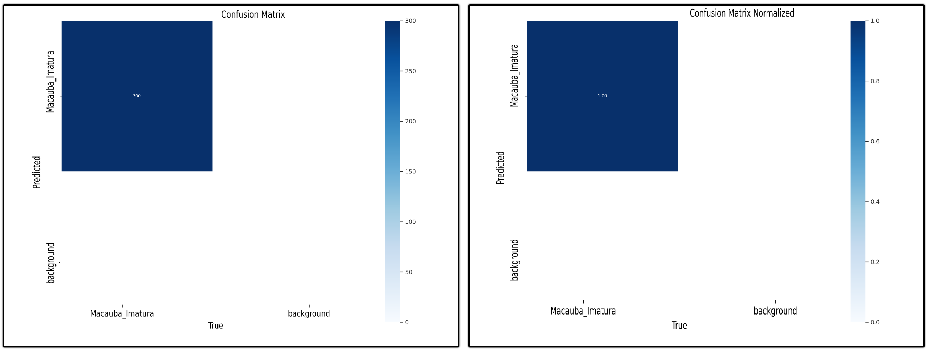 Table 2 reports the post-validation detection performance for the “Immature Macauba” class over 300 images and 300 instances. Both precision and recall attain a value of 1.00, indicating flawless identification with no false positives or false negatives. An