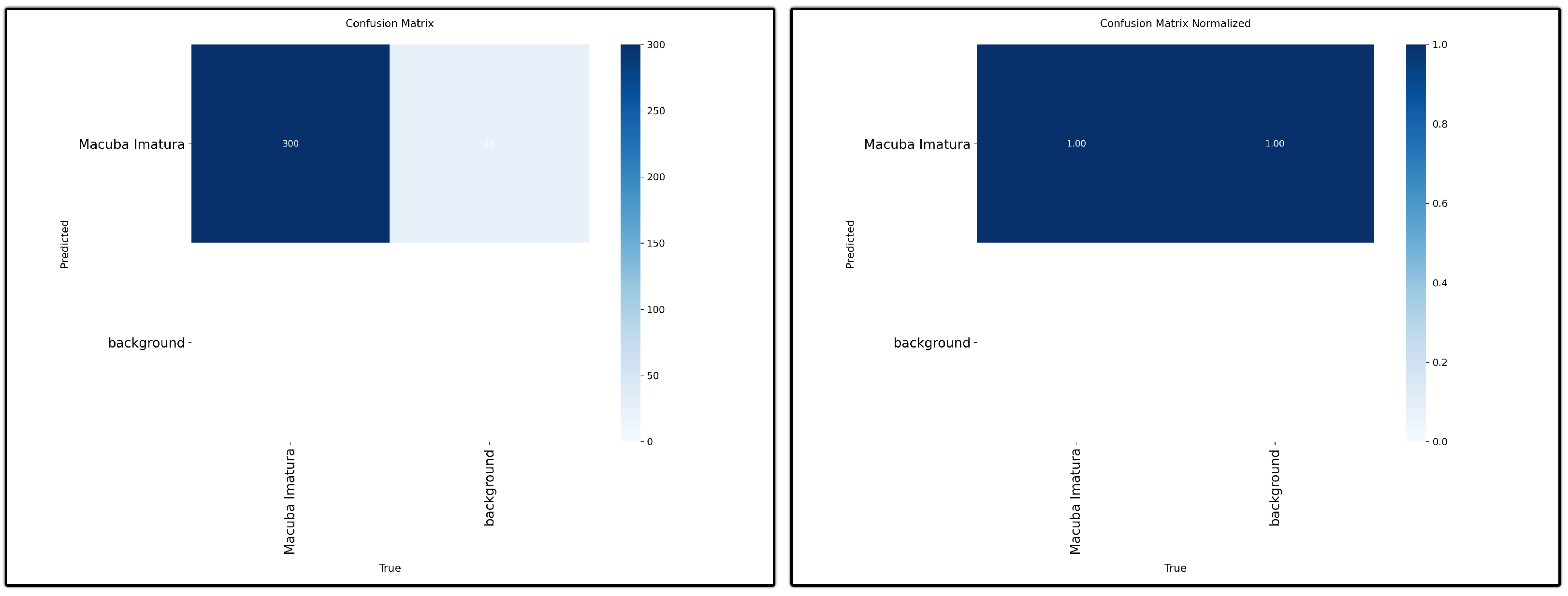 In the normalized confusion matrix for YOLO-v11x, every “Immature Macauba” instance is correctly classified—the only nonzero cell lies at the intersection of true positives and predicted positives, yielding a fully saturated diagonal with no false positives or false negatives. By contrast, the YOLO-v12x confusion matrix also shows perfect detection of the “Immature Macauba” class (normalized value of 1.00 on the diagonal) but reveals a critical failure in background discrimination: All background samples are systematically labeled as “Immature Macauba”, as evidenced by the 1.00 entry in the background false-positive cell, and there is no cell corresponding to correct background predictions. In other words, although both models achieve 100% accuracy on the target class, YOLO-v11x reliably rejects non-object regions, whereas YOLO-v12x completely fails to distinguish background, compromising its robustness in contexts where background clutter is present (