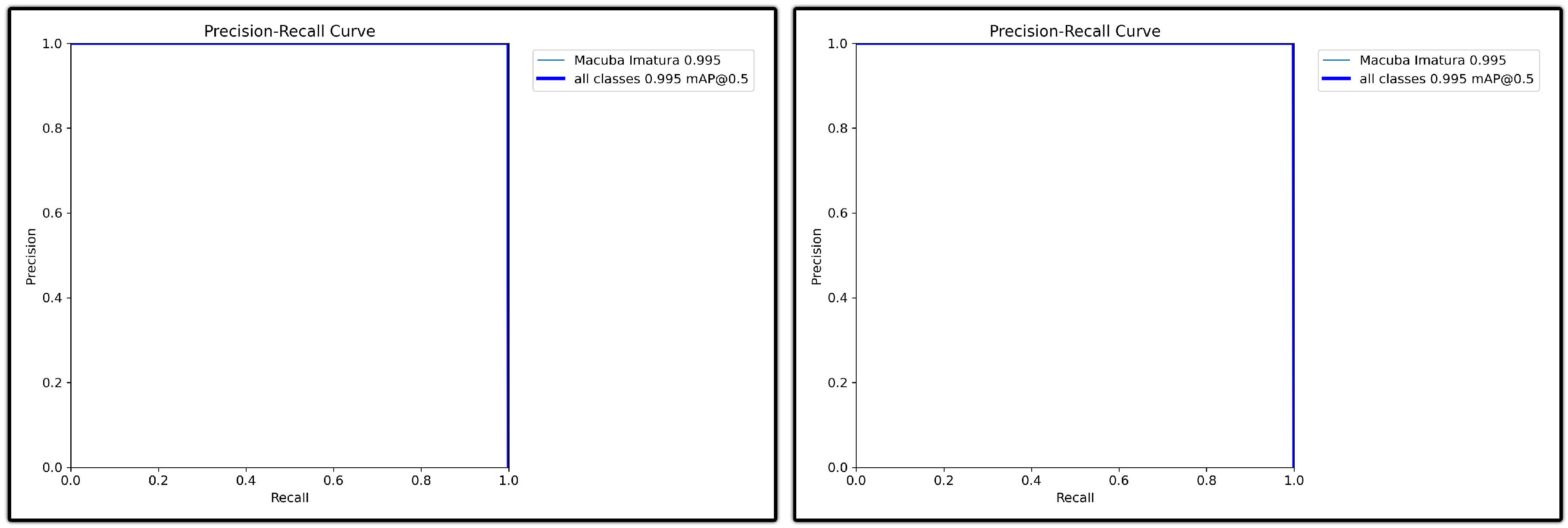 In both precision–recall plots, the behavior is essentially identical: Precision remains at its maximum value (1.00) over nearly the entire recall range, collapsing abruptly only when recall reaches 1.00. In each figure, the curve for the “Immature Macauba” class and the aggregated curve for all classes overlap almost perfectly, reflecting an