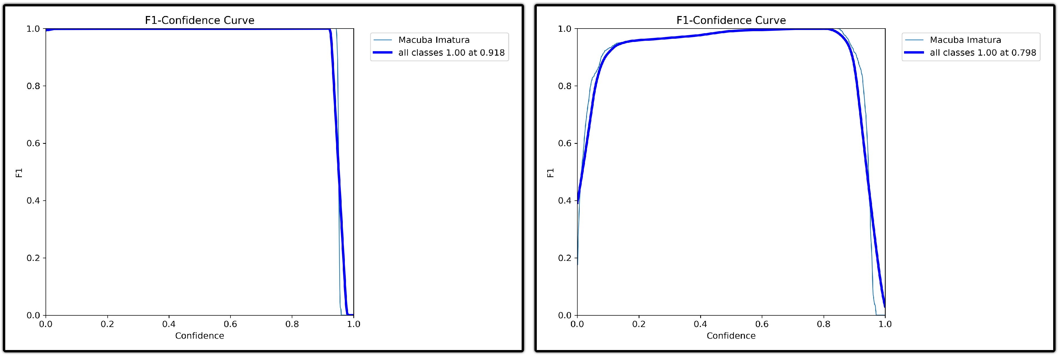 Figure 16 demonstrates a strong equilibrium between precision and recall, thereby supporting the proposed model’s validity. In the first plot, the aggregated F1-score curve reaches its maximum value of 1.00 only when the confidence threshold approaches approximately 0.918, remaining nearly constant between 0.99 and 1.00 from the start of the interval until that point, and then plummeting abruptly to zero at higher thresholds. The curve for the “Immature Macauba” class follows this same pattern, exhibiting only minimal variations around the optimal threshold. In contrast, the second plot shows that the aggregated F1 score attains 1.00 at about 0.798 and remains stable across a broad plateau, with F1 exceeding 0.95 over a threshold range of roughly 0.10 to 0.80. Moreover, the initial ascent of this curve is more gradual, indicating greater model tolerance to low confidence thresholds, whereas in the first plot, the performance is essentially at its maximum even at minimal confidence. In both cases, the “Immature Macauba” curves mirror the aggregated behavior, albeit with slight oscillations. These findings suggest that the second model not only achieves the optimal balance between precision and recall at a lower confidence threshold but also demonstrates a significantly more robust and flexible performance, allowing the use of reduced thresholds without a substantial loss in detection quality. A threshold of 80% was adopted during the algorithm’s inference phase, effectively preventing confusion between macauba fruits and other species unless the neural network weights are trained on additional plants. In real-world applications, false positives (FP) tend to be more frequent when the detection threshold is set below 80%, particularly in diverse datasets.