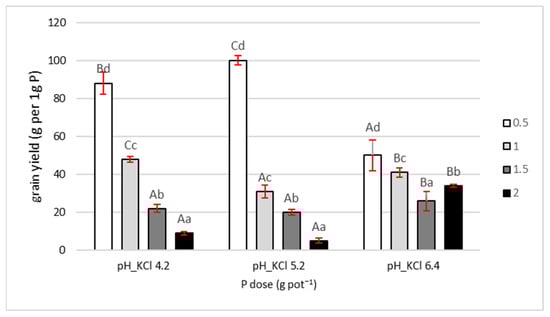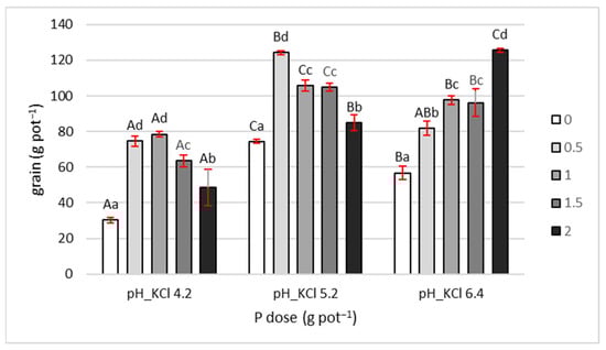 Grain yield. Values are expressed as means ± SE. Different lowercase letters indicate statistically significant differences between P doses within the same pH level; uppercase letters indicate differences between pH levels (Tukey’s HSD test, p < 0.05).
