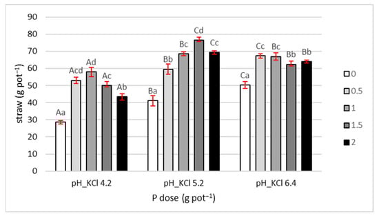 Straw yield. Values are expressed as means ± SE. Different lowercase letters indicate statistically significant differences between P doses within the same pH level; uppercase letters indicate differences between pH levels (Tukey’s HSD test, p < 0.05).