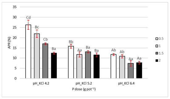 Apparent phosphorus recovery APR. Values are expressed as means ± SE. Different lowercase letters indicate statistically significant differences between P doses within the same pH level; uppercase letters indicate differences between pH levels (Tukey’s HSD test, p < 0.05).