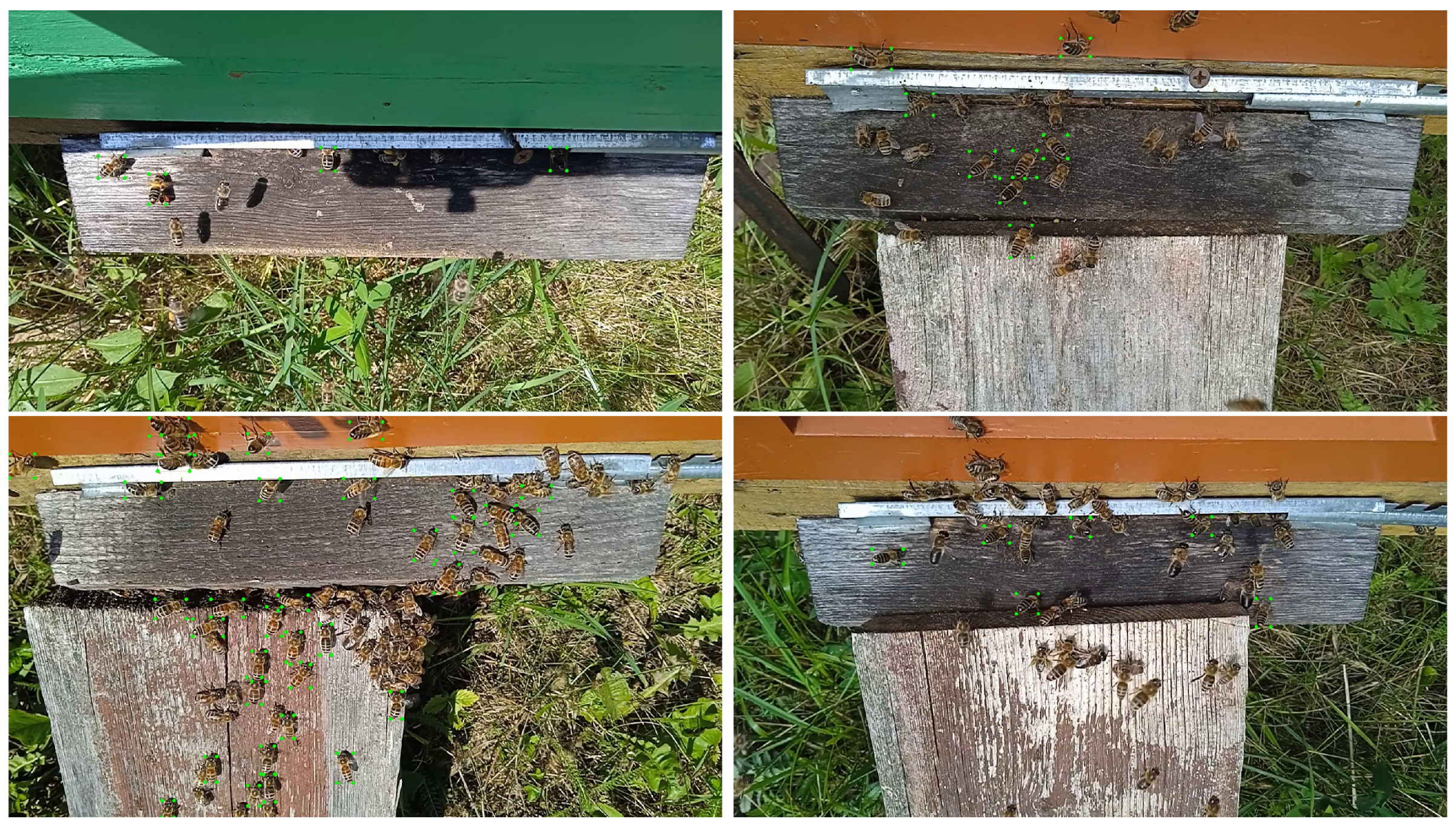 32]. Recordings were made under both sunny and cloudy conditions to capture a range of environmental variability. Individual frames were extracted from the raw video for annotation. The dataset comprises high-resolution images collected from four different beehives, each corresponding to a colony exhibiting fanning behavior, capturing diverse environmental contexts and insect activity. All images were carefully annotated for the detection of fanning bees using the