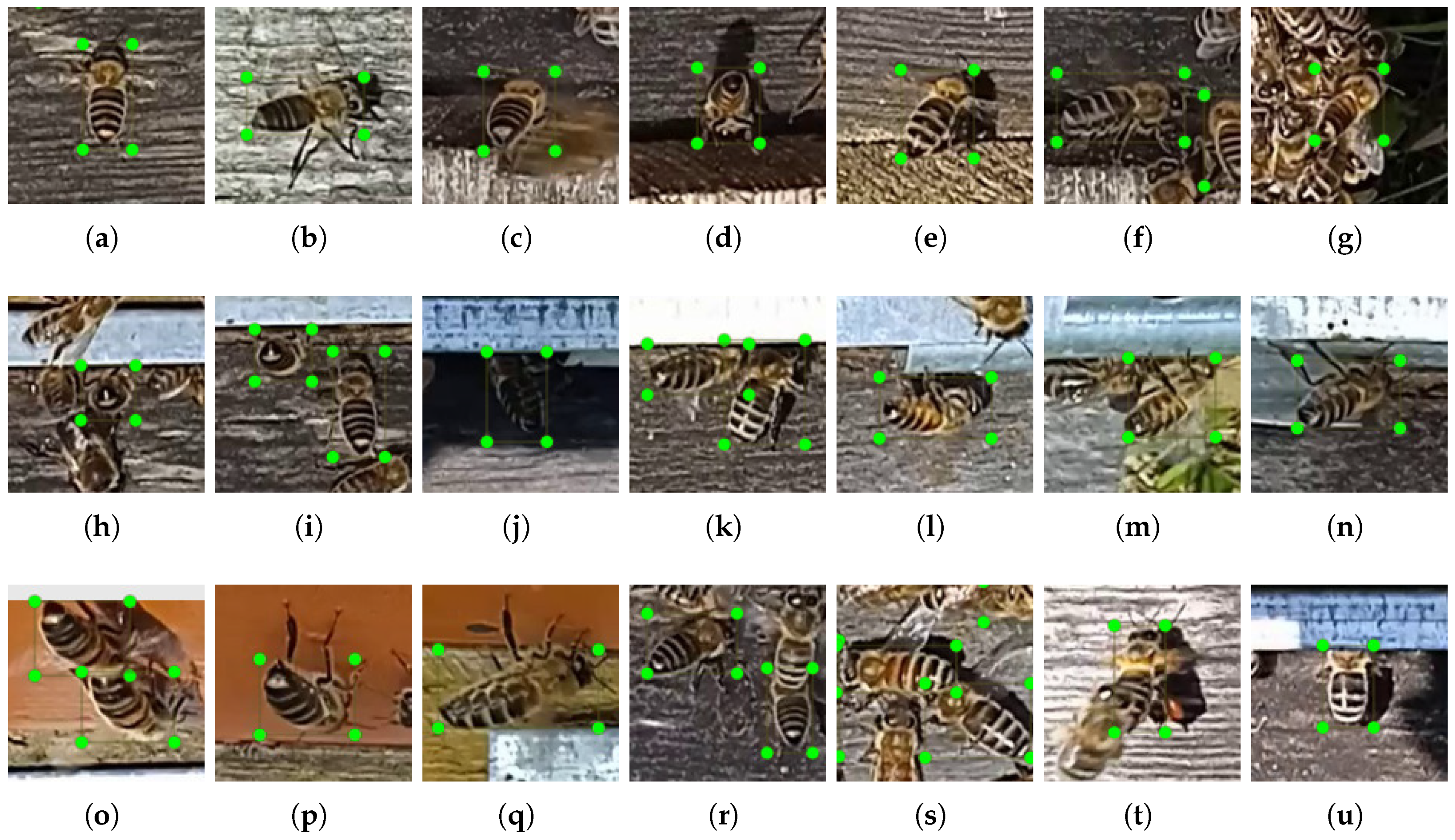 Figure 2r–u illustrate cases of partial occlusion, where bees are either obstructed by other individuals or hive structures. These images emphasize the need for detection models to be resilient to variable backgrounds, occlusions, and spatial positions.