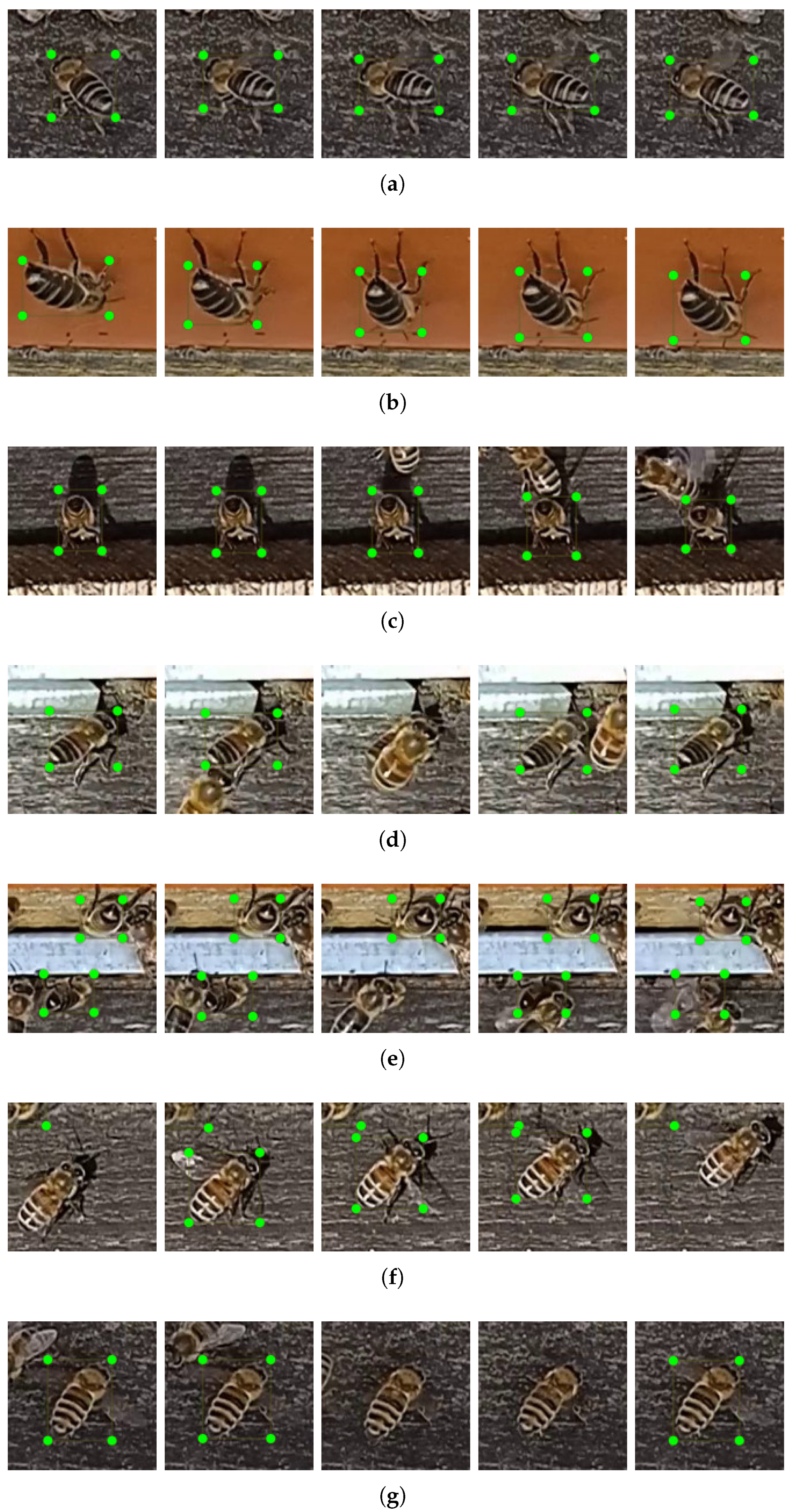 Figure 3g shows a bee briefly pausing during fanning, reflecting the intermittent nature of this behavior. These nuanced examples are essential for informing spatiotemporal model design, as they demonstrate that fanning cannot always be defined by static posture alone but requires temporal analysis of motion patterns such as wing vibration and abdominal positioning.