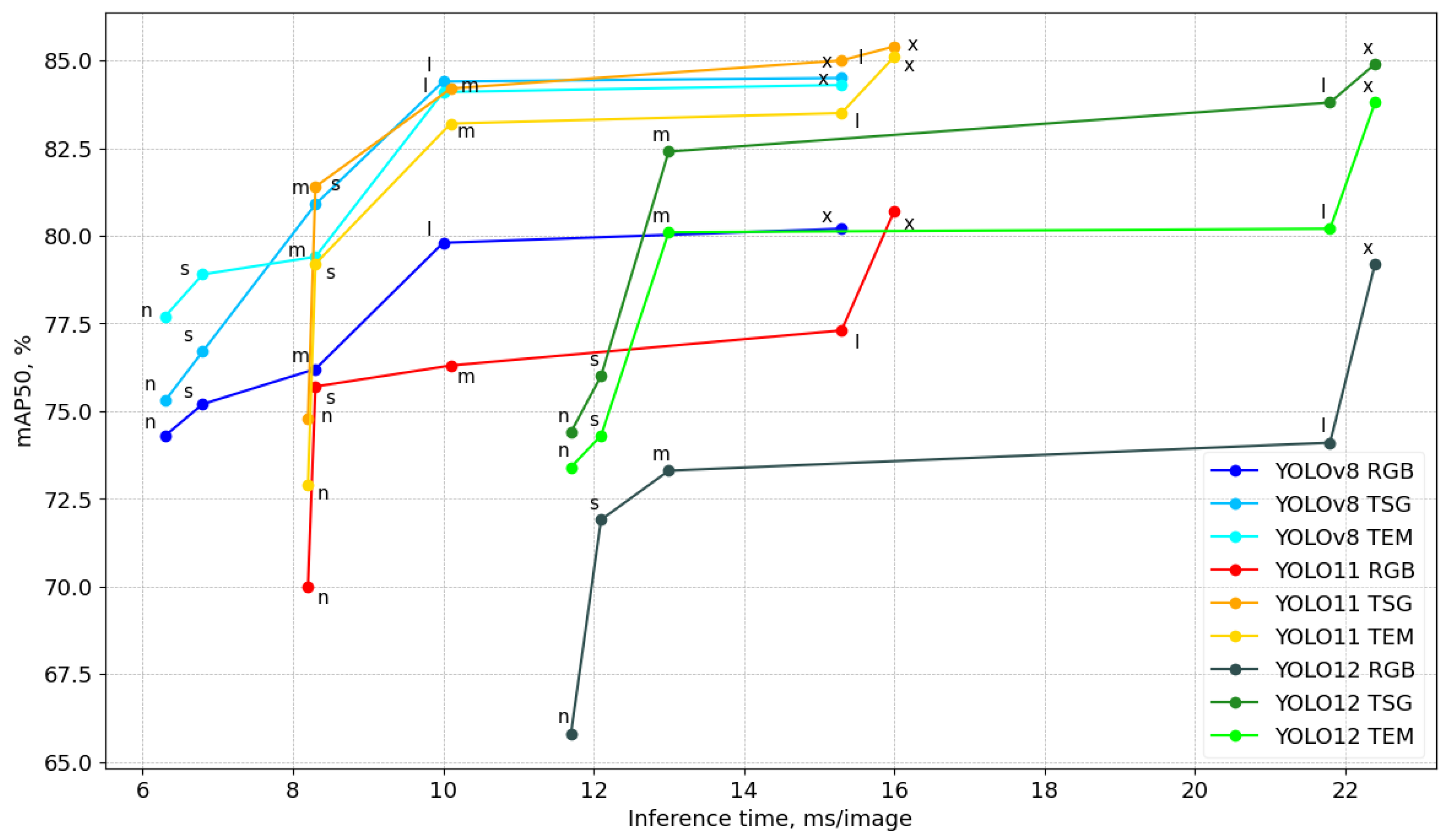 TSG and TEM input encodings show a notable performance improvement over their corresponding RGB variants across all tested YOLO models, particularly in terms of precision at comparable or even lower inference times. YOLOv8m with TSG reaches approximately 81% mAP50 at around 8 ms, while the YOLOv8m RGB variant achieves only about 76% mAP50 at a similar inference time, an improvement of 5% in precision. YOLO11m with TSG improves from 76% (RGB) to 84% (TSG) while maintaining an inference time of 10 ms, offering an 8% gain in precision with no latency trade-off. In the YOLO12l model, TSG boosts accuracy from 74% (RGB) to 84%. Here, a 10% gain in precision comes with no increase in inference time.