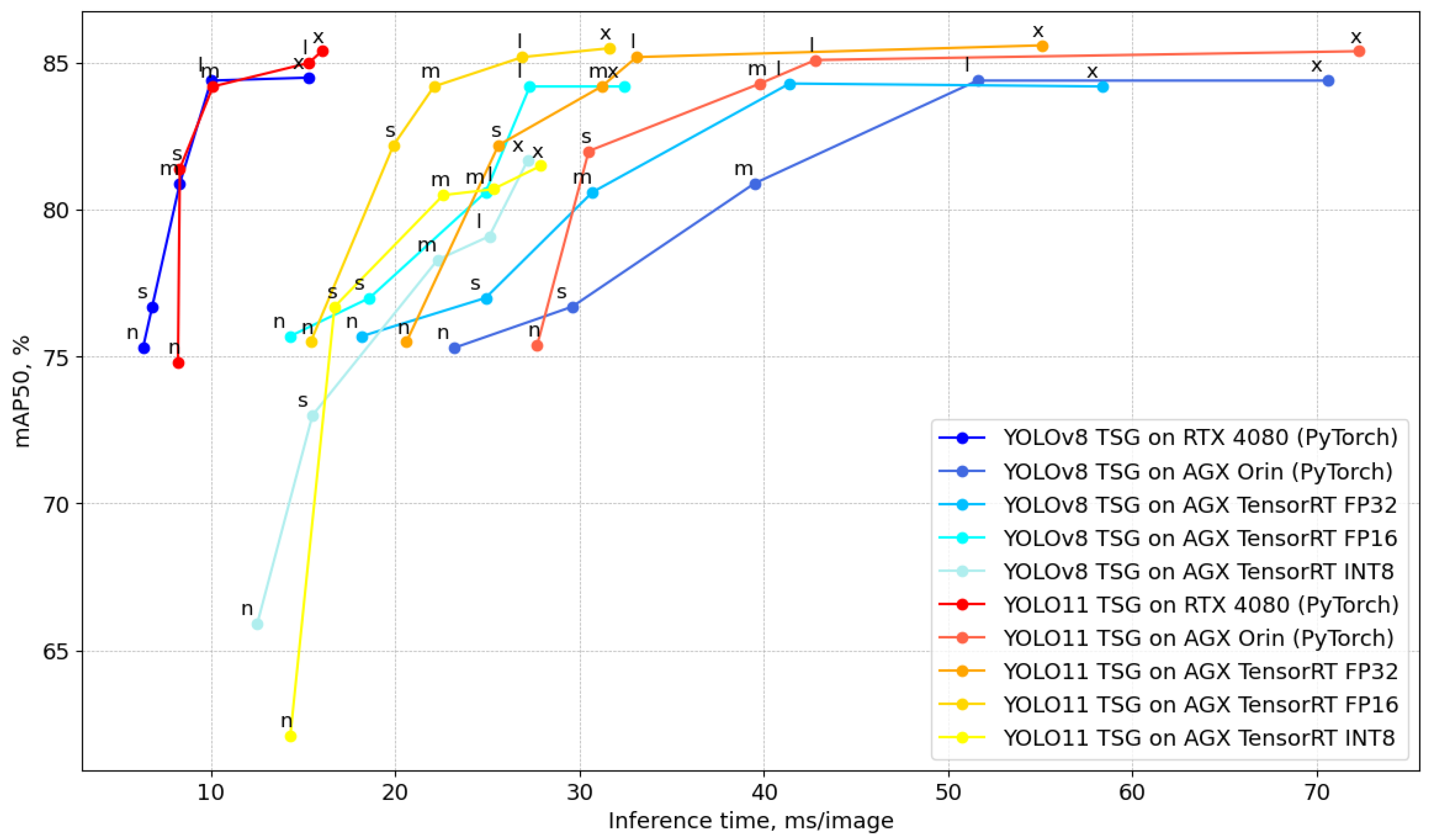 Accuracy degradation due to TensorRT conversion was minimal across precision levels. FP16 models provided a good balance between accuracy and efficiency, often achieving near-FP32 precision levels while nearly doubling frame rate compared to PyTorch inference. For example, YOLO11m’s inference time is reduced from 40 ms to 22 ms when using FP16 precision, with no observed drop in accuracy. On average, models converted to INT8 achieve even faster processing speeds, but this comes at the cost of a slight reduction in precision. Notably, the smaller the model, the greater the drop in mAP50, typically ranging from 1% to 5%, excluding nano models, where the reduction often exceeds 10%.