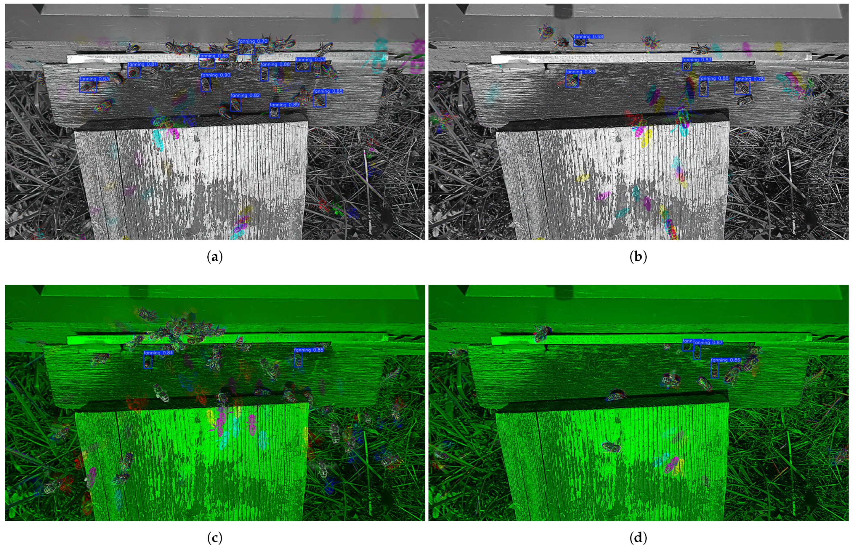 Figure 7c,d. These visualizations highlight the models’ ability to accurately localize fanning bees in complex visual scenes characterized by high bee density, variable lighting, and partial occlusion.