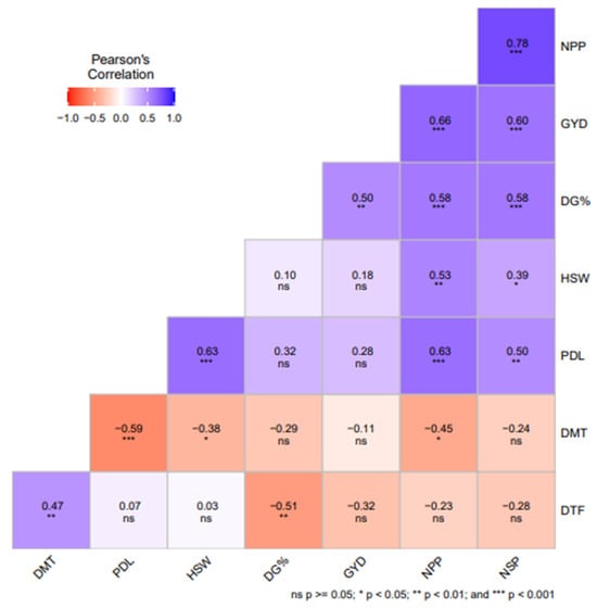 Correlation coefficients of grain yield and associated traits among 30 cowpea genotypes evaluated in two sites in Eswatini. Note: The color variation shows the extent of correlations; deep blue shows strong and positive correlations, while deep red shows strong negative correlation. *, **, and *** denote significance associations at 0.05, 0.01, and <0.001 probability values, respectively. ns = Not significant; DG % = Percent seed germination; DTF = Days to 50% flowering; DMT = Days to maturity; PDL = Pod length (cm); NPP = Number of Pods per plant; NSP = Number of Seeds per pod; HSW = Hundred seed weight (g/100 seed); GYD = Grain yield (kg ha−1).