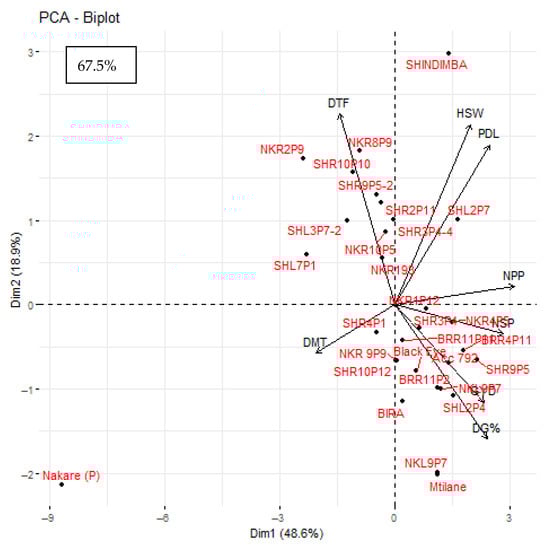 The principal component biplot illustrated the correlation between the assessed traits and genotypes (Figure 2). The narrow angles between vectors (for HSW and PDL, NPP and NSP, as well as GYD, NSP, and DG %) resolved strong positive correlations. Most assesed genotypes were scattered with positive trends in the first principal component, with genotypes NKR1P12, SHR3P4, NKR4P5, BRR11P11, BRR4P11, Black eye, Accession 792, SHR9P5, BEE11P2, SHL2P4, Bira, NKL9P7, Mtilane, and SHR10P12 outperforming in grain yield and yield components.