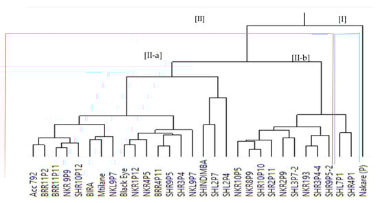 Phenotypic diversity and genotype grouping were further assessed using cluster analysis. The analysis revealed the test genotypes into two distinct major clusters, I and II. Cluster II had two sub-clusters designated as II-a and II-b (Figure 3). Cluster II consisted of 29 genotypes, allocating 18 genotypes in II-a and 11 genotypes in II-b. Sub-cluster II-a constituted all three check genotypes (Accession 792, Mtilane and Black Eye) acquired from the genebank of Eswatini and two founder mutant parent lines (Bira and Shindimba) from MAWLR/Namibia. Also, elite mutants such as BRR11P2, BRR11P11, NKR9P9, SHR10P12, NKR1P12, NKR4P5, BRR4P11, SHR9P5, SHR3P4, and NKL9P7 were grouped in II-a. Sub-cluster II-b constituted mutant genotypes only (NKR10P5, NKR8P9, SHR10P10, SHR2P11, NKR2P9, SHL3P7-2, NKR193, SHR3P4-4, SHR9P5-2, SHL7P1, and SHR4P1). Interestingly, Cluster I only constituted one genotype, Nakare.
