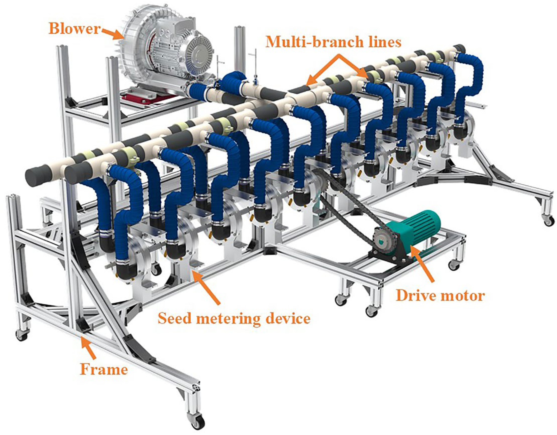 - Wang, B.; Na, Y.; Chen, M.; Ge, Z.; Pan, Y.; Liu, J.; Wu, W.; Luo, X. Design and Experiment on a Distributed Seed Delivery System with a Pneumatic Central-Cylinder Seeder. Agronomy 2023, 13, 1337. [Google Scholar] [CrossRef]