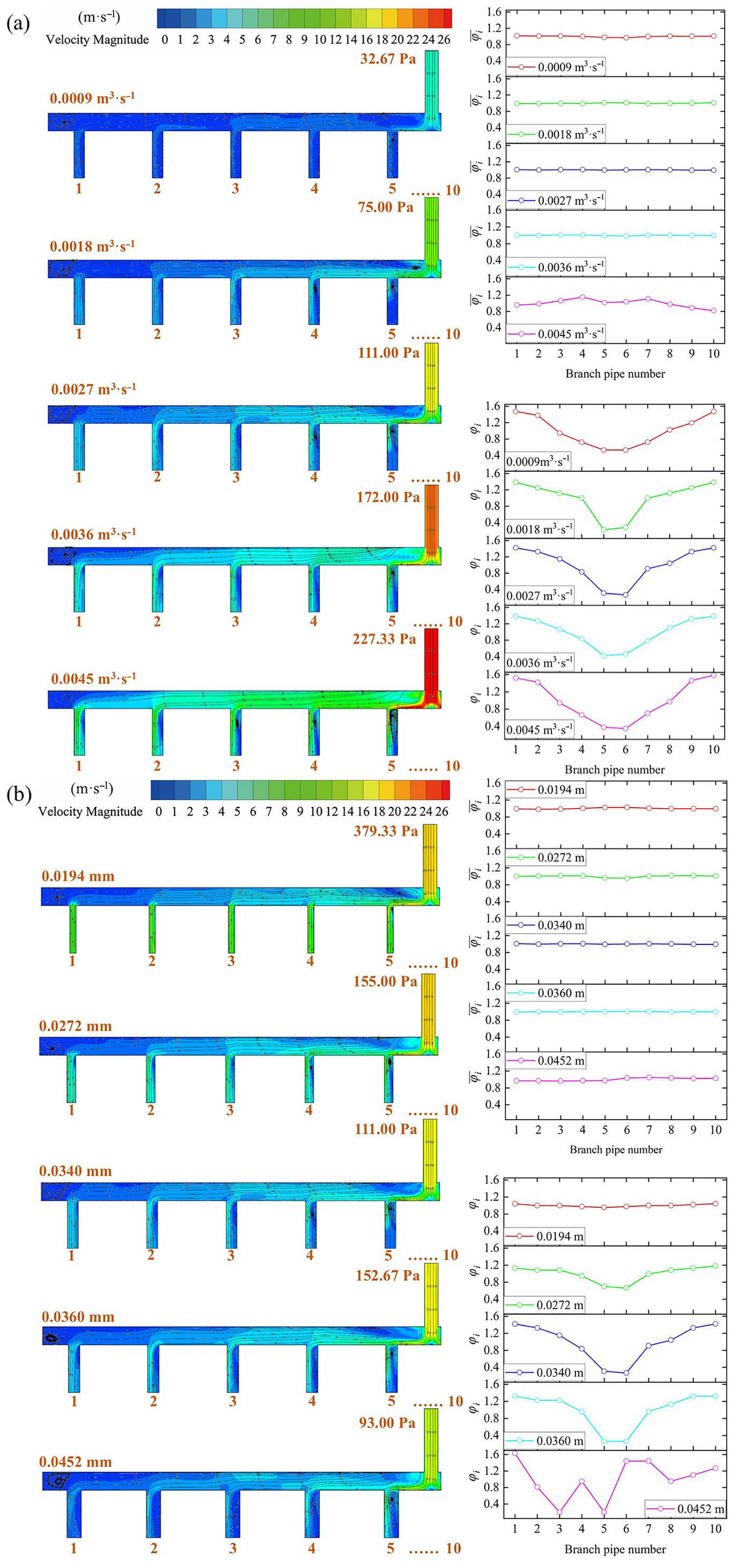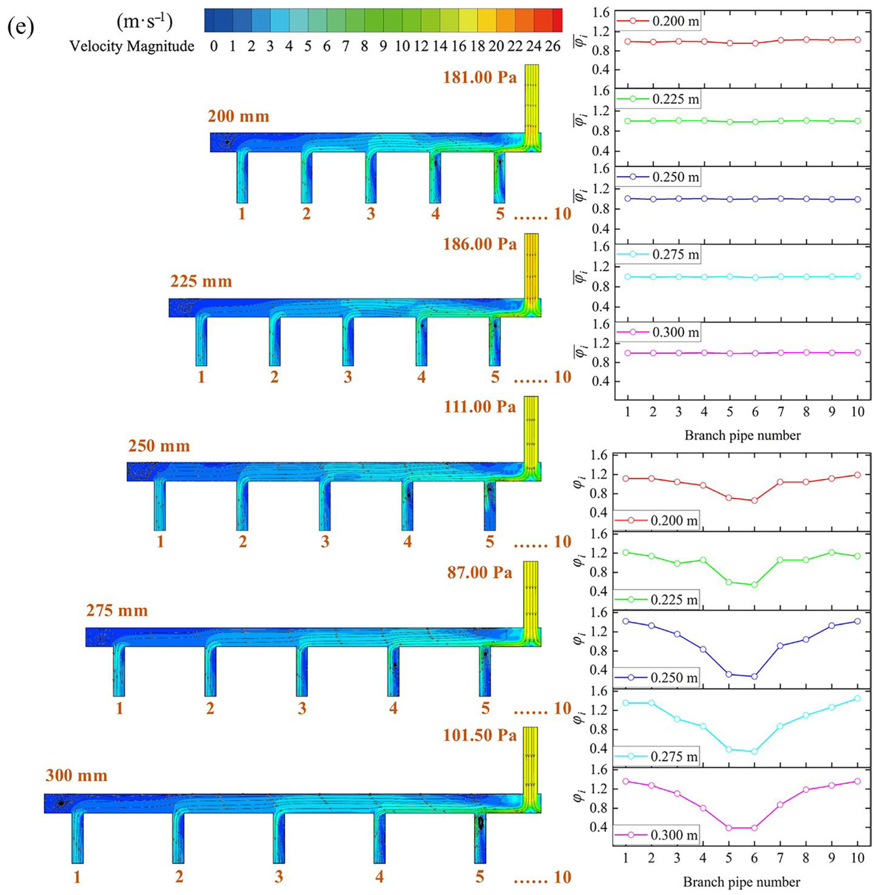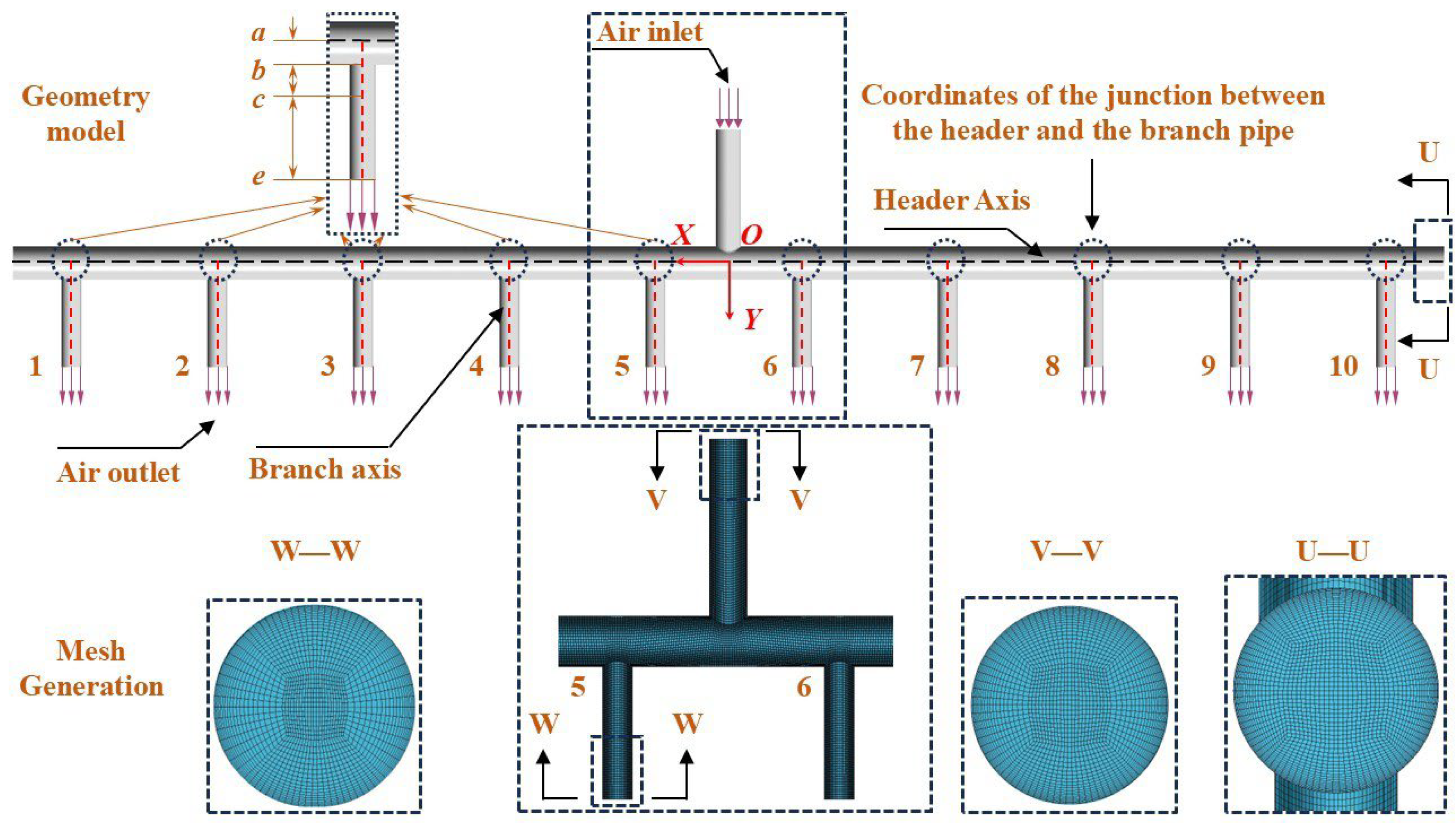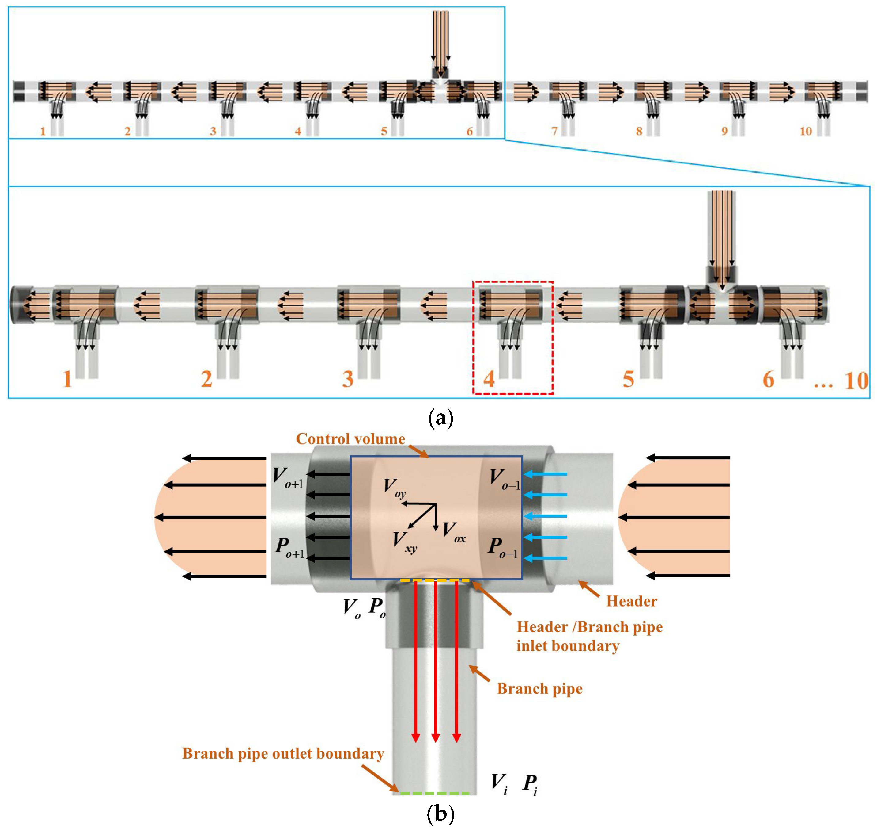 - Qin, L.; Zhou, F.; Yang, J.; Wu, R.; Lu, L. Numerical Research on Flow Distribution and Pressure Loss of Multi-Branch Pipeline Based on Confluence and Distribution. J. South China Univ. Technol. (Nat. Sci. Ed.) 2021, 49, 109–119. [Google Scholar]