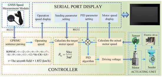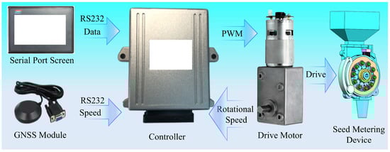 To achieve precise rotational speed control for the rice direct-seeding metering device, an electric drive transformation was carried out based on the designed precision hill direct-seeding metering device, and an electric drive control system for rice hill direct seeding was developed. As shown in Figure 1, this system comprises components such as a GNSS speed measurement module, a serial port display, a controller, a motor, and a metering device. By integrating the GNSS speed measurement module, real-time operational speed data of the rice direct-seeding metering device can be obtained, enabling more accurate control and adjustment. Meanwhile, the serial port display facilitates real-time monitoring and parameter adjustment of the system, enhances the convenience of the experimental process and the reliability of results. As the system’s core component, the controller plays a crucial role in communication and coordinating the operation of each component. At the same time, the motor serves as the driving device for the metering device. Through the design of the electric drive control system and the configuration of the metering device, the precision and stability of the rice direct-seeding metering device can be improved, providing better technical support and solutions for the automation development of rice precision direct-seeding metering devices.