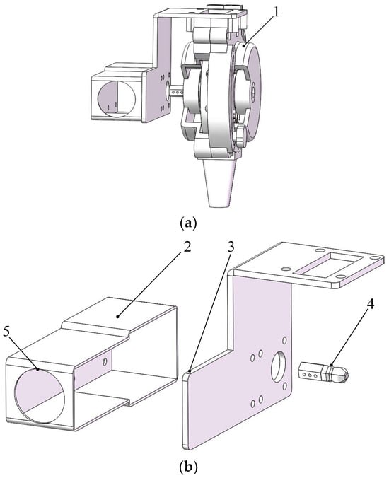 Design of the metering device. (a) Overall assembly drawing: 1. Metering device; (b) Part axonometric drawing: 2. Motor waterproof housing; 3. Motor bracket; 4. Coupling; 5. Ventilation hole.