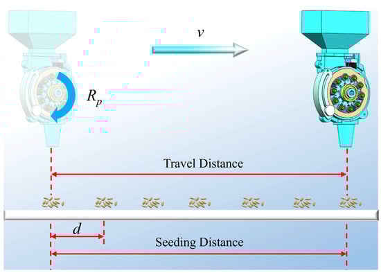 The electric drive control system for rice hill direct seeding used a motor to drive the metering device. According to the hill spacing required by agronomic needs and the operation speed obtained in real time, the motor speed was regulated to achieve speed-adaptive hill seeding. The consistency of hill spacing was a prerequisite for ensuring good seeding quality. To improve the consistency of hill spacing under electric drive control of rice hill direct seeding, it is necessary to clarify the corresponding relationship among the driving motor speed, hill spacing, and the direct-seeding machine’s operation speed, as shown in Figure 3.